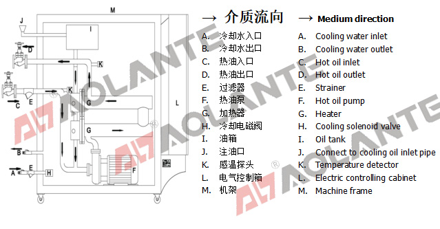 傳熱媒體(油)通過I(油箱)進入系統(tǒng),由F(循環(huán)油泵)打到模具后再回到系統(tǒng),周而復(fù)始。媒體(油)在經(jīng)過G(加熱器)升溫,由K(感溫探頭)探測媒體(油)溫度,當(dāng)溫度達到要求時,G(加熱器)停止工作。當(dāng)溫度需要下降時,H(電磁閥)打開,冷卻水由A經(jīng)過B到H(電磁閥)進入熱交換器,熱交換器里的熱水經(jīng)過B排到冷卻水塔,從而間接使熱循環(huán)油系統(tǒng)內(nèi)溫度下降。